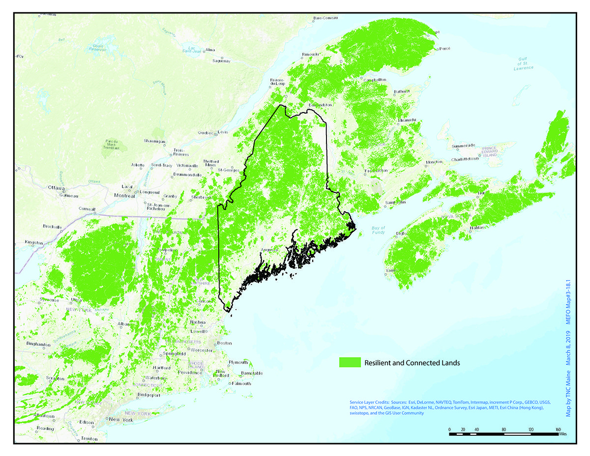 In mapping done by The Nature Conservancy, Maine has a strong concentration of climate-resilient lands – settings with the capacity to support a wide array of species and accommodate movement of species in a warming world. The ecological value and interconnectivity of Maine’s highly forested landscape make the 30×30 conservation goal especially important – for Maine and the larger world. Courtesy of TNC Maine [Click to enlarge]